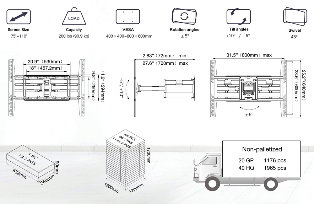 Giá treo tivi xoay SP5 màu đen được cấu tạo bằng sắt, sơn tĩnh điện, sản phẩm lắp cho màn hình tivi 50" - 90" có trọng lượng giá 17,4kg, tải trọng giá 90,9kg. Tâm lổ hữu dụng 100 x 200 mm đến 400 x 600 mm. Kích thước D x R x C = 73 x 34 x 14 (cm). Giá điều chỉnh được góc nghiêng +15o và góc xoay 180o .