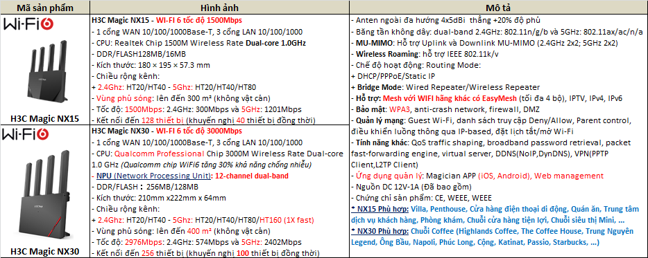 H3C Magic NX30 tốc độ 3000Mbps, là bộ phát wifi áp dụng các công nghệ giao thức không dây Wi-Fi 6 mới nhất của New H3C Intelligence Terminal Co., Ltd.,. Nó cung cấp tốc độ truyền không dây tổng cộng là 2976 Mbps, với tốc độ 2,4 GHz tăng lên 574 Mbps và tốc độ 5 GHz tăng lên 2402 Mbps.